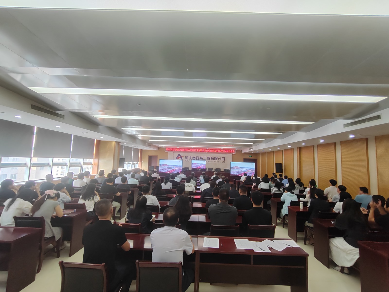 2025年9月3日,為紀念中國人民抗日戰(zhàn)爭暨世界反法西斯戰(zhàn)爭勝利80周年,河北省安裝工程有限公司積極組織職工集中觀看閱兵盛況直播。公司機關(guān)及各分公司、項目部共計2000余人通過多種方式同步參與,共同回顧歷史、緬懷先烈、展望未來。上午9時,習近平總書記發(fā)表重要講話,9時19分大閱兵正式開始,公司機關(guān)及各分公司、項目部會議室座無虛席,職工們們整齊地坐在屏幕前,神情莊重地注視著電視畫面。在閱兵式過程中,